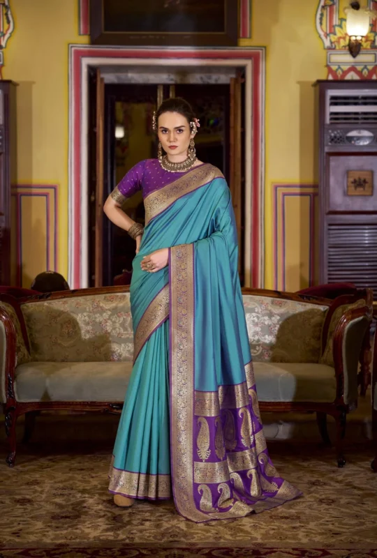 ₹3,795Turquoise Luxury Soft Banarasi Silk with Golden Zari Grandeur Saree