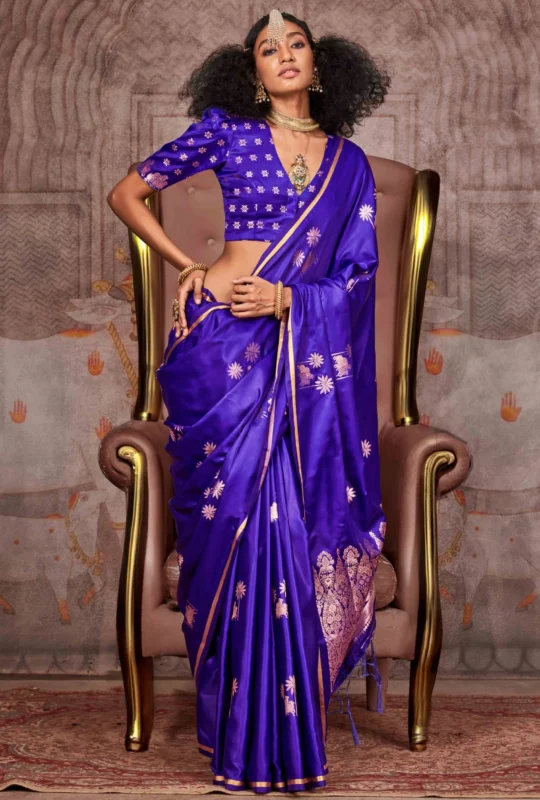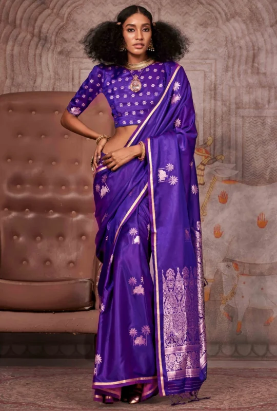 ₹3,499Violet Floral Luxe Zari Weaving Satin Banarasi Silk Saree