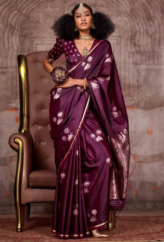 ₹3,795Wine Floral Luxe Zari Weaving Satin Banarasi Silk Saree