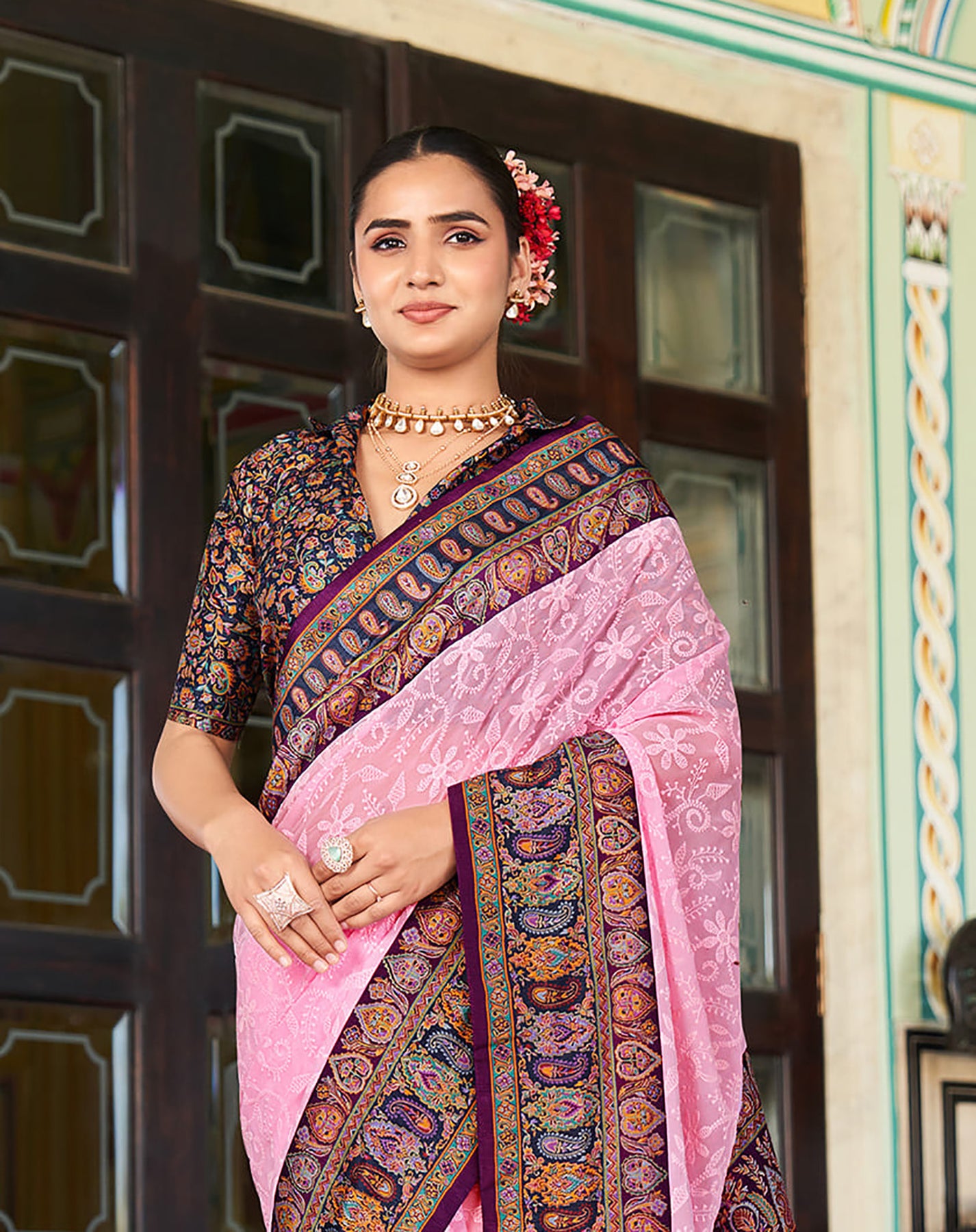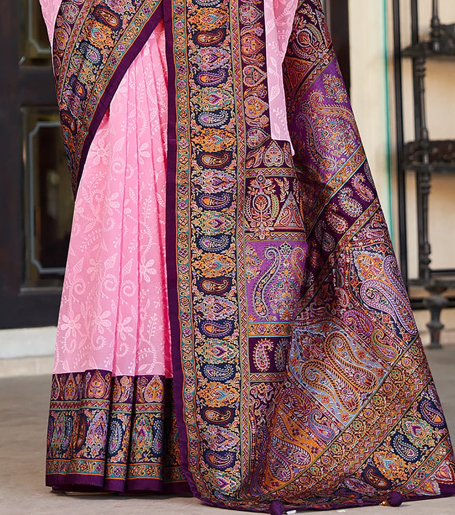 Baby Pink Poly Viscose Georgette Lucknowi Chikankari Work Fusion Pashmina Saree