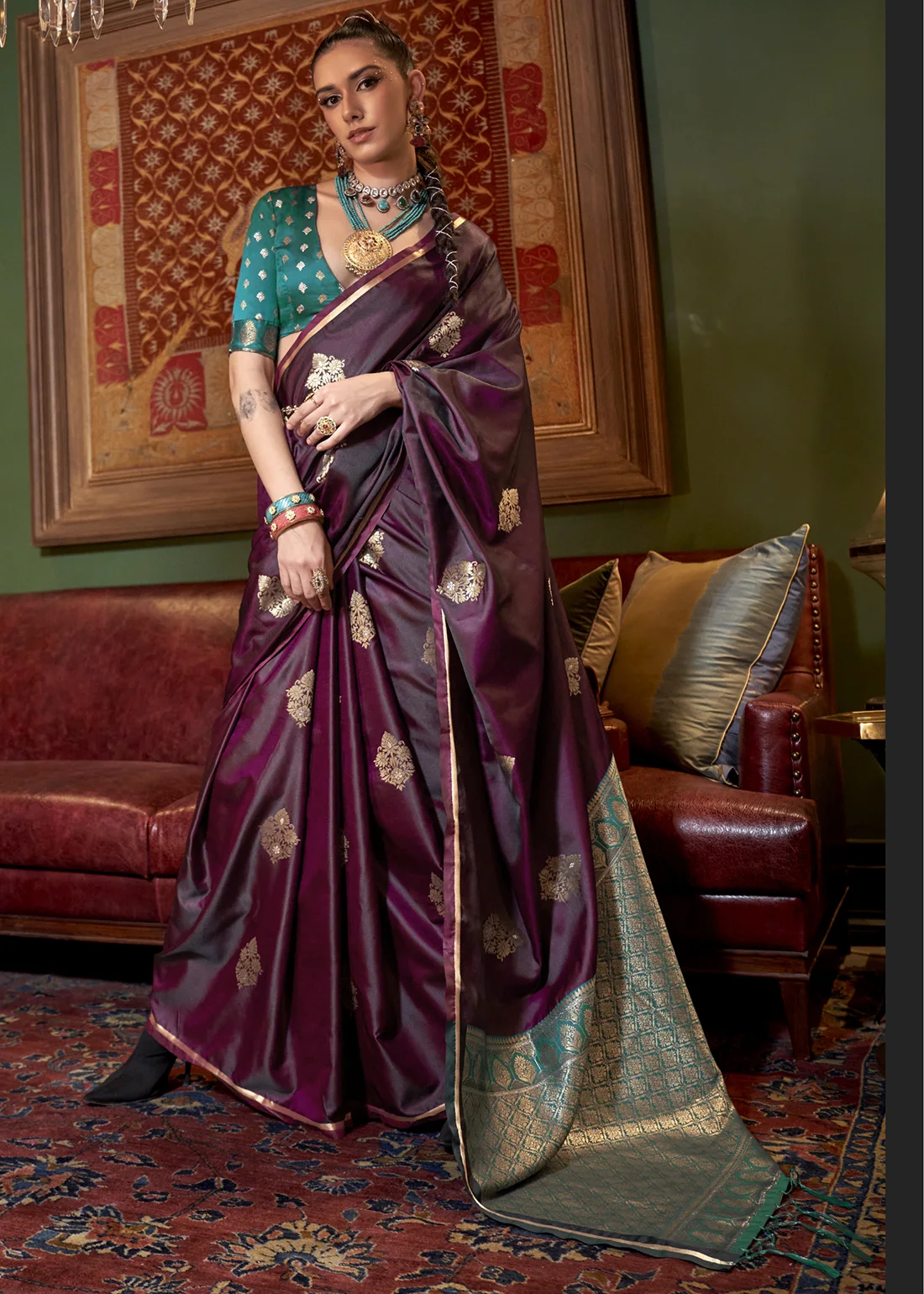 Berry Wine Luxe Banarasi Satin Silk Saree
