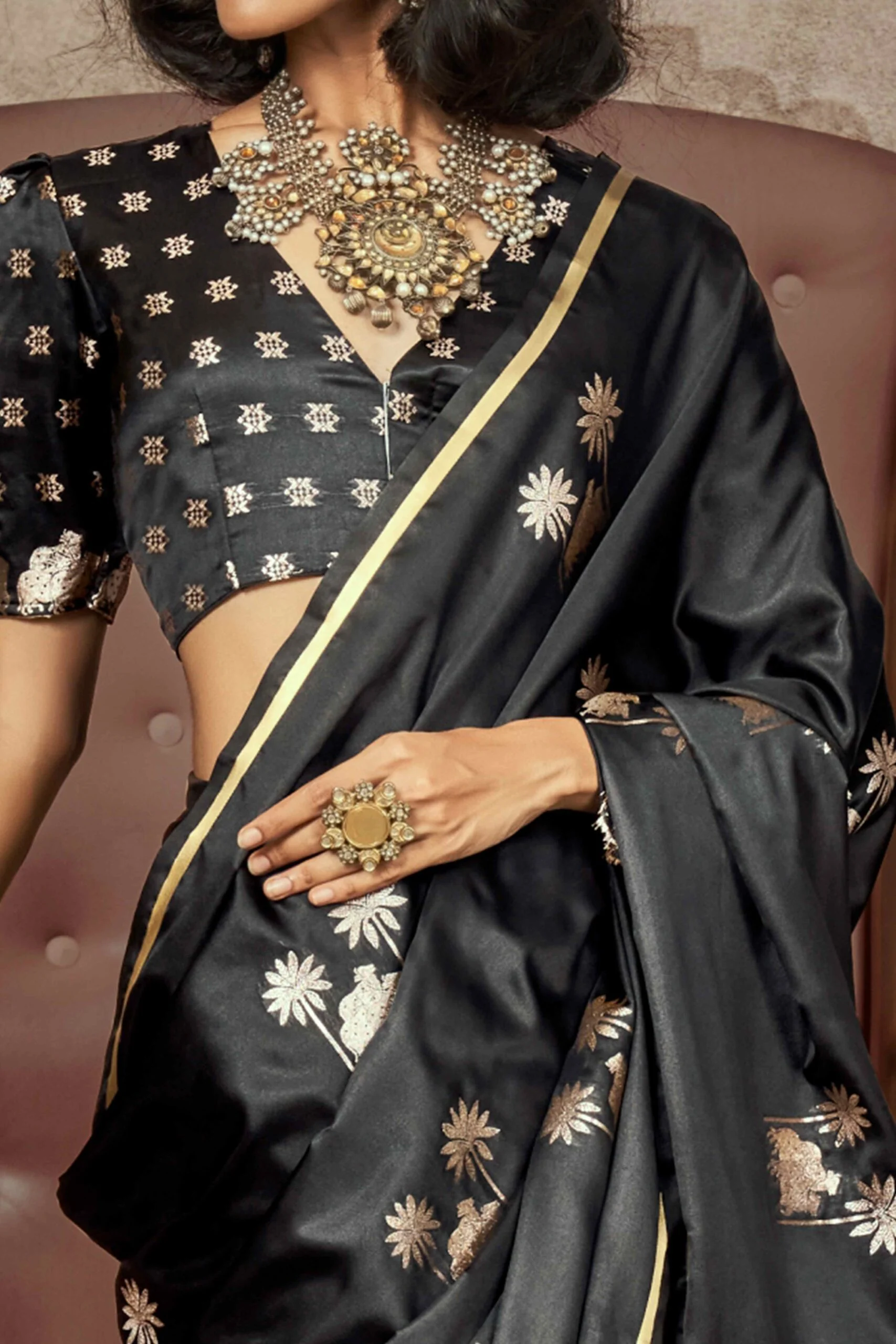 Black Floral Luxe Zari Weaving Satin Banarasi Silk Saree