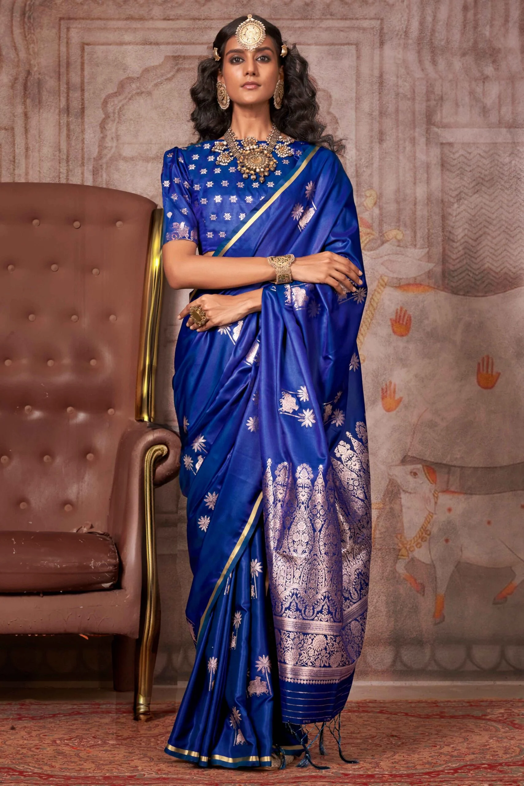 Blue Floral Luxe Zari Weaving Satin Banarasi Silk Saree