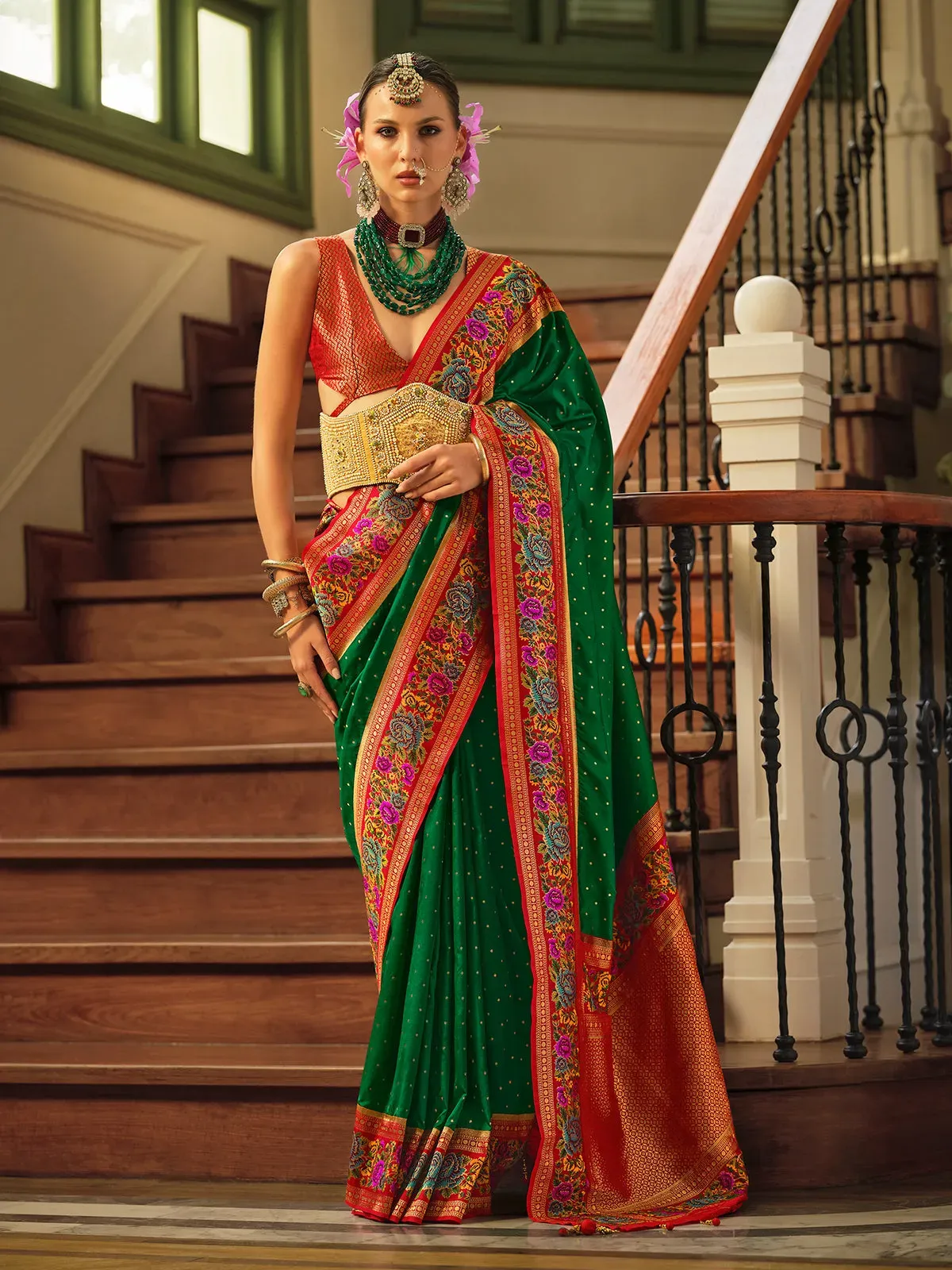 Regal Dark Green Luxe Poly Viscose Banarasi Silk saree with woven zari borders.