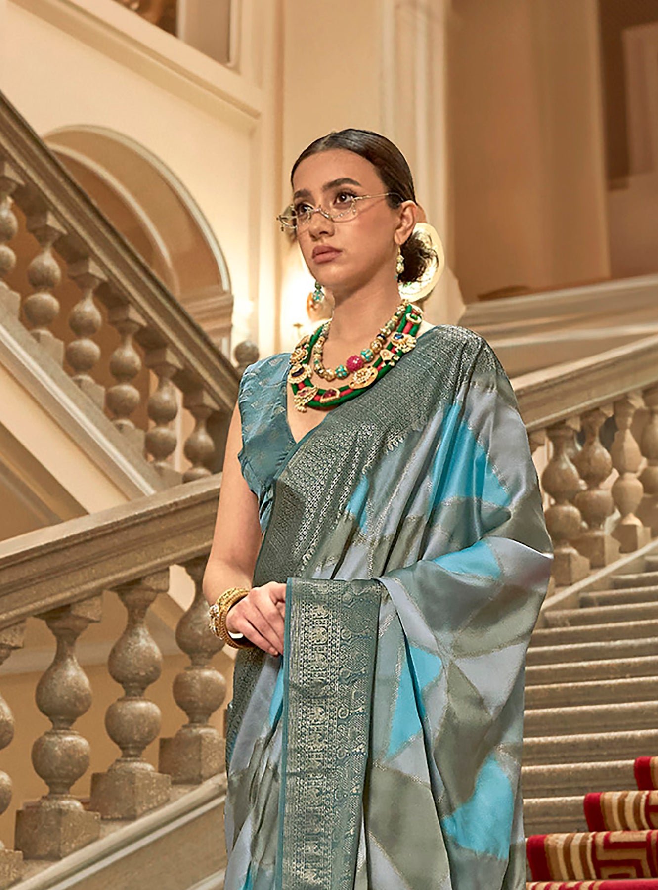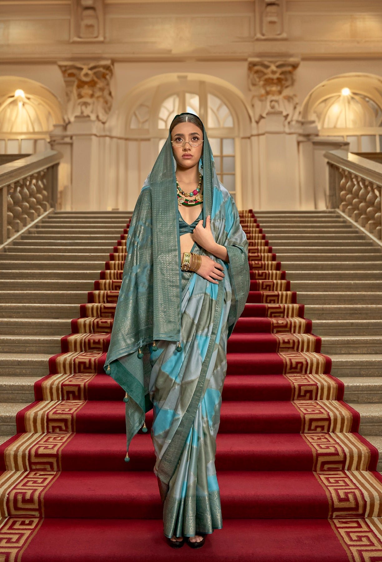 Elegant Dove Grey Rangat Saree in Poly Viscose Satin Silk with foil printed woven artistry—perfect for festive gatherings.