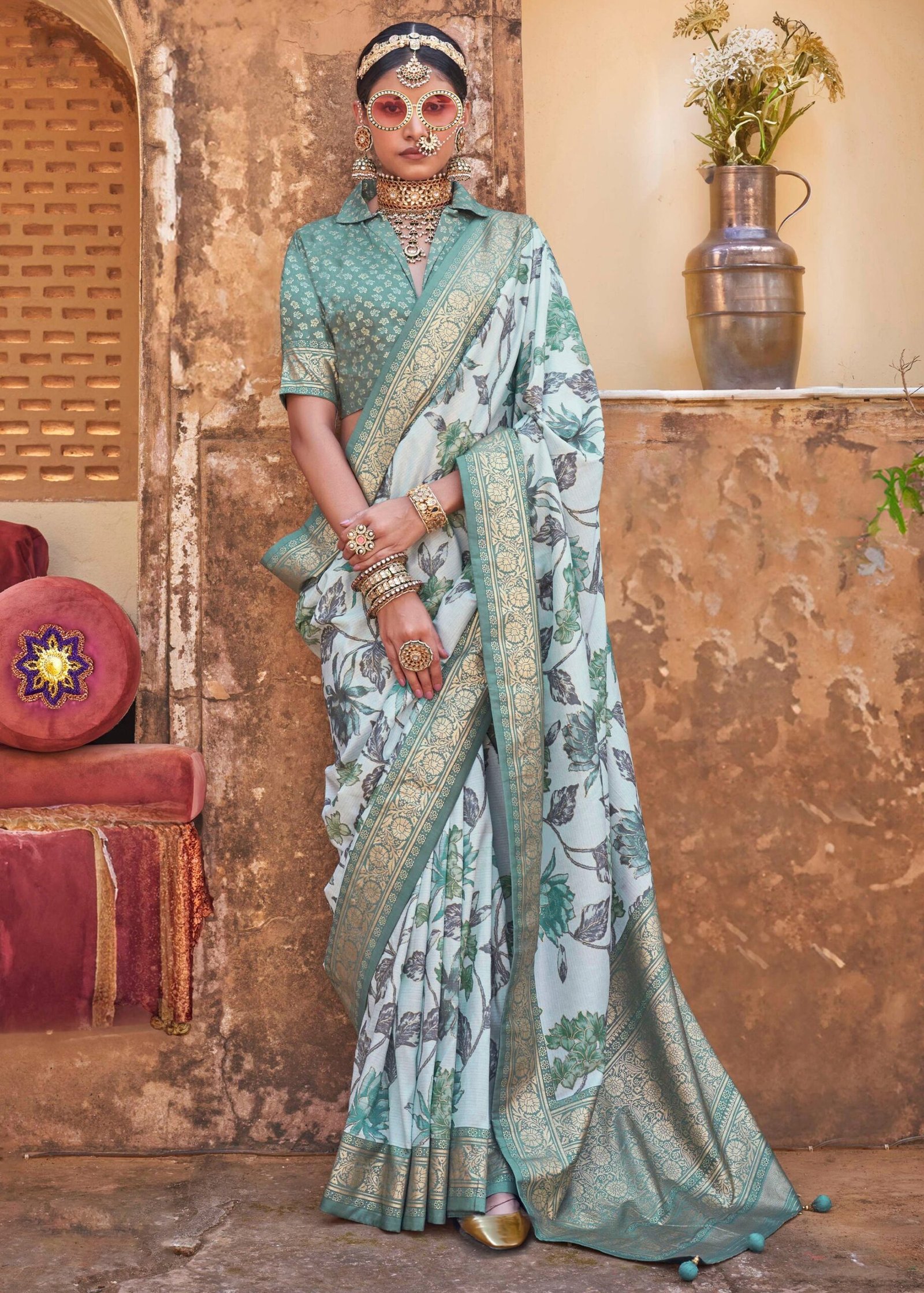 Dusky Green Luxe Floral Printed Silk Saree