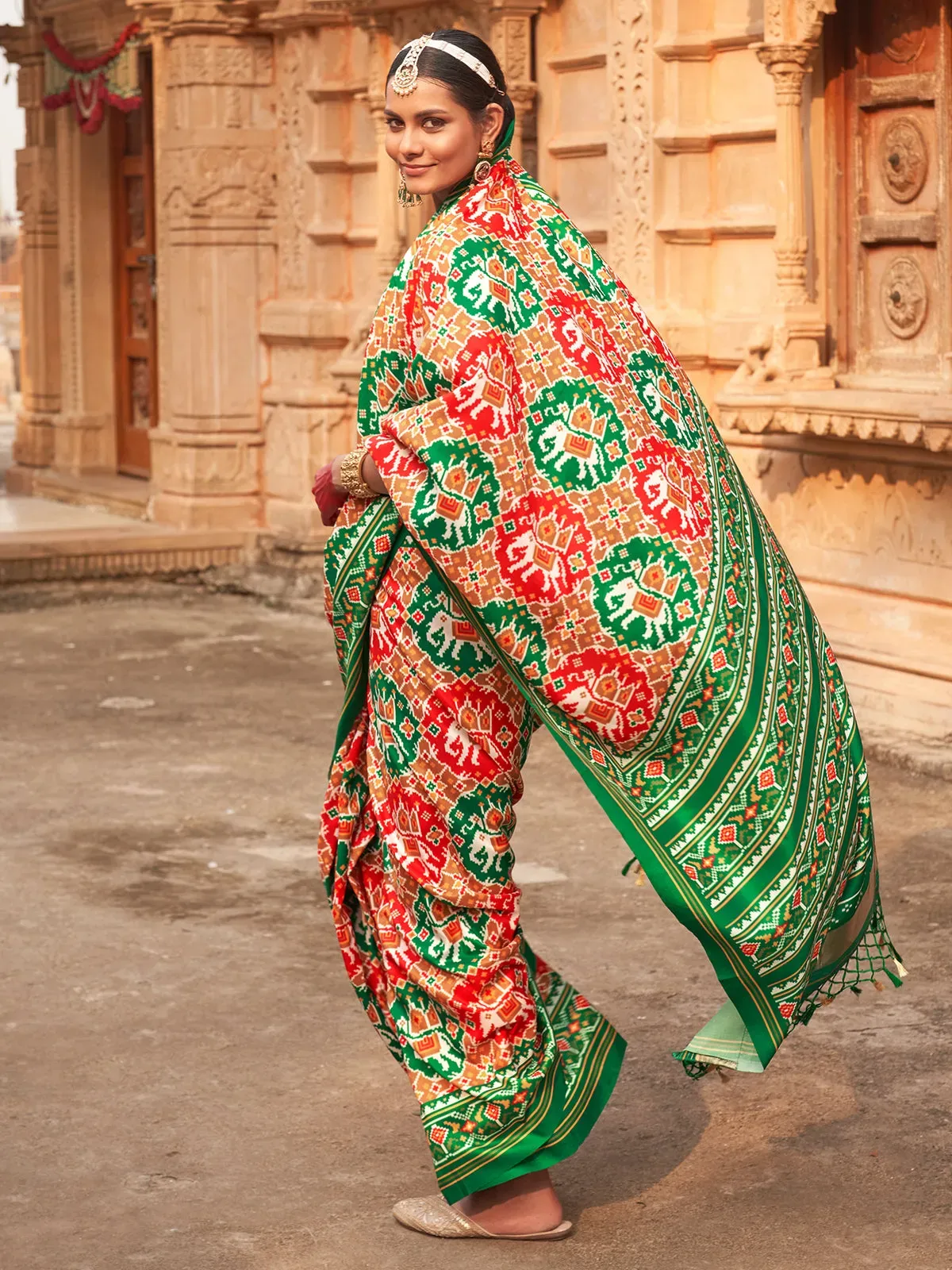 Elegant Equator Green Patola Saree with soft silk texture and printed work, designed for weddings and events.