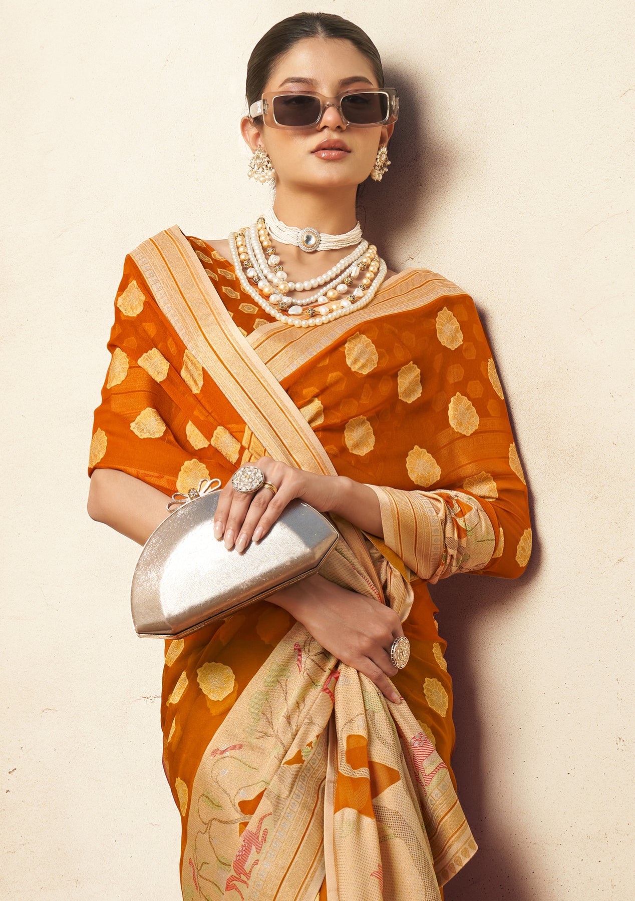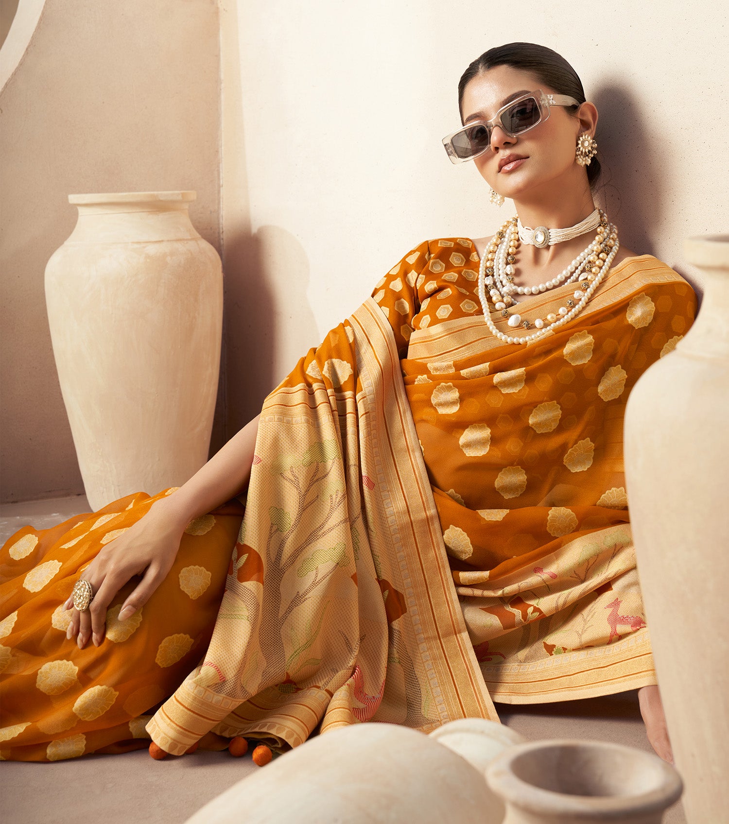 A cheerful and stylish saree in Gamboge Yellow, made in Pure Georgette and adorned with elegant floral motifs.