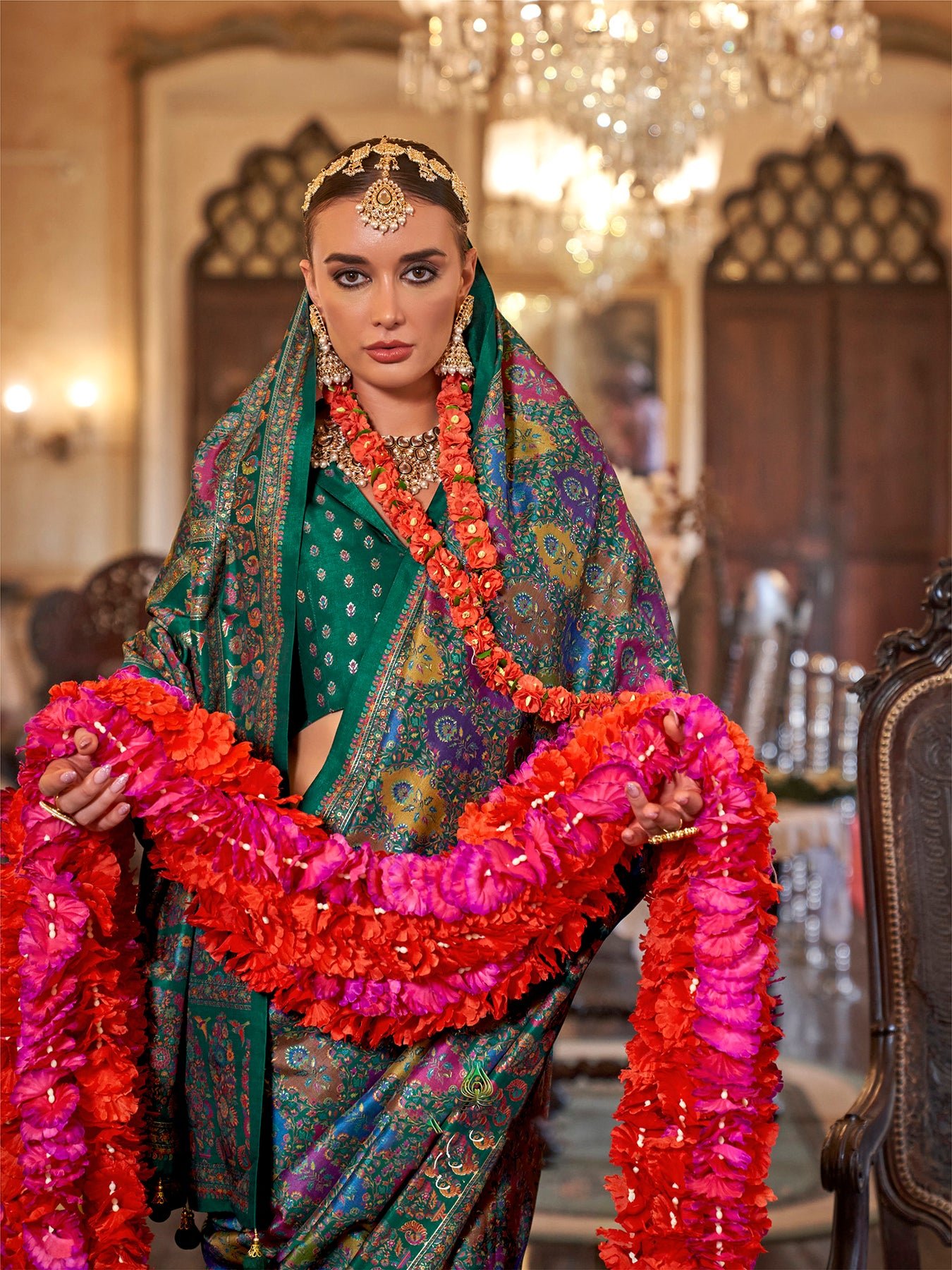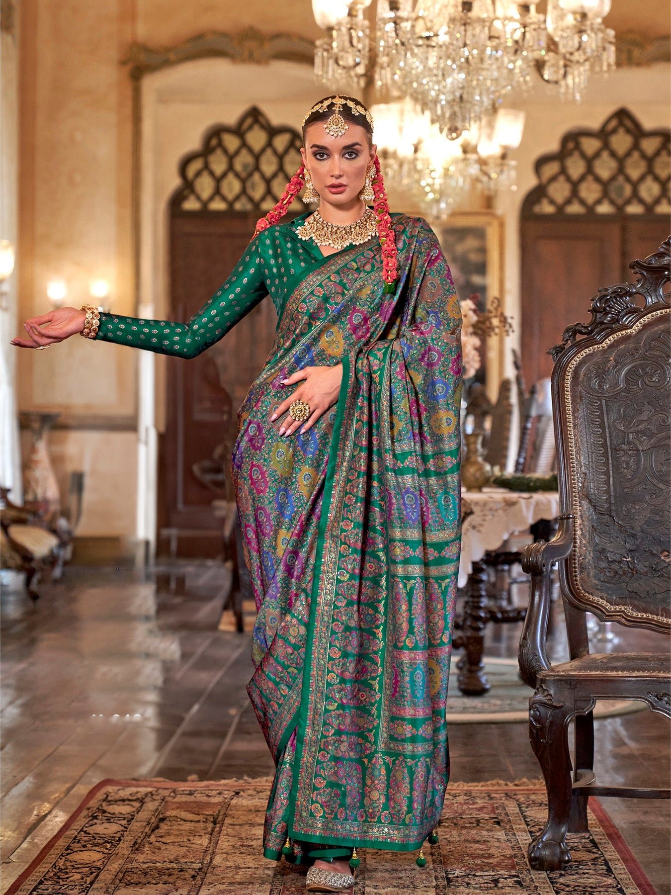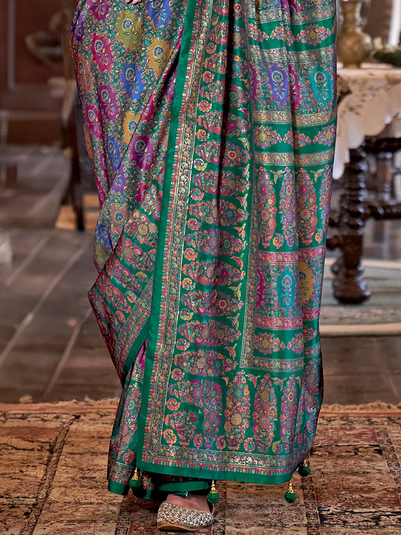 Vibrant and fresh, this Green Poly Viscose Silk Saree with floral pashmina design is perfect for weddings and celebrations.