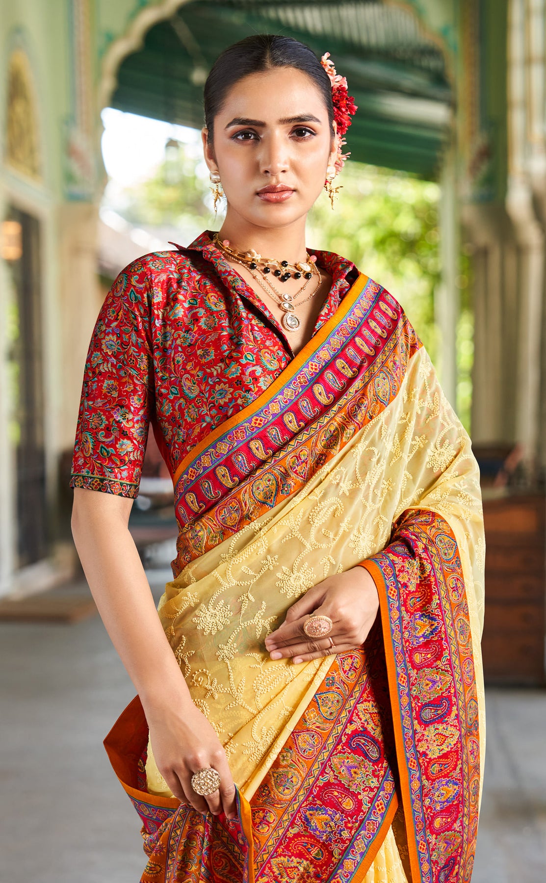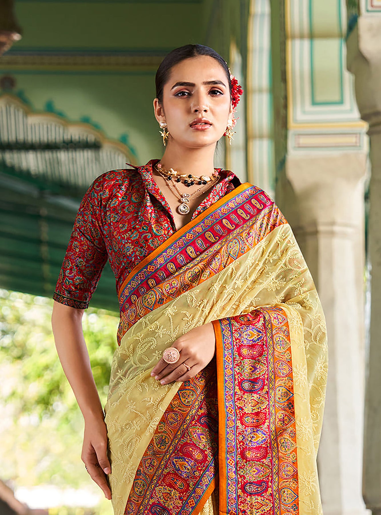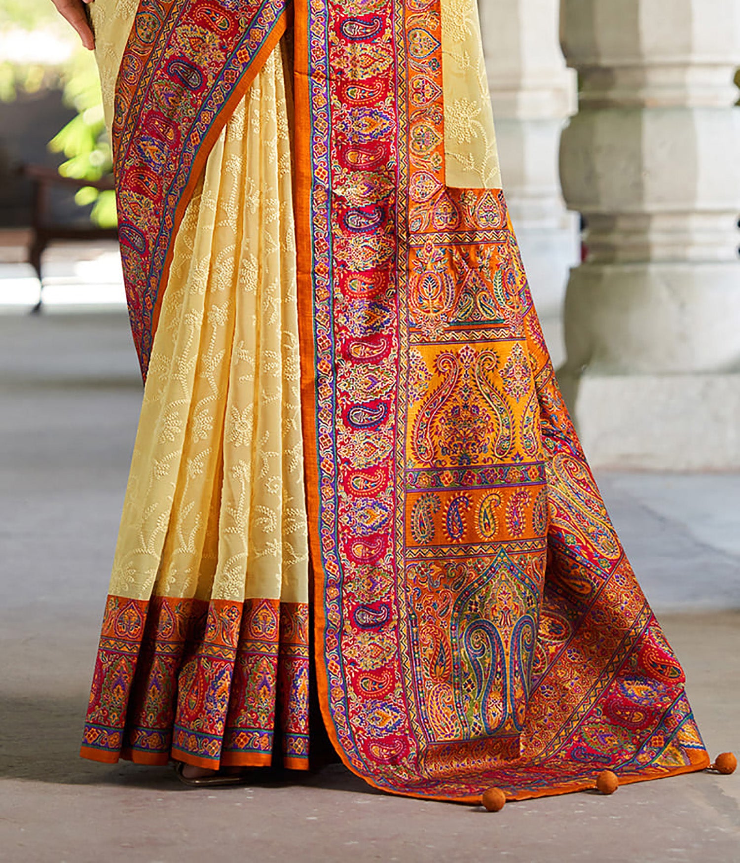 Ivory Poly Viscose Georgette Lucknowi Chikankari Work Fusion Pashmina Saree