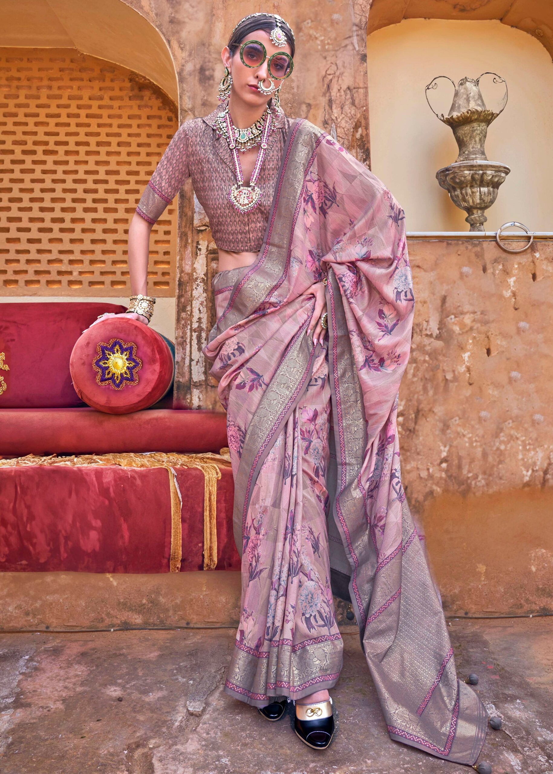 A graceful Mauve Pink Luxe Floral Printed Silk Saree with elegant floral details that enhance its richness—ideal for weddings and festivals.