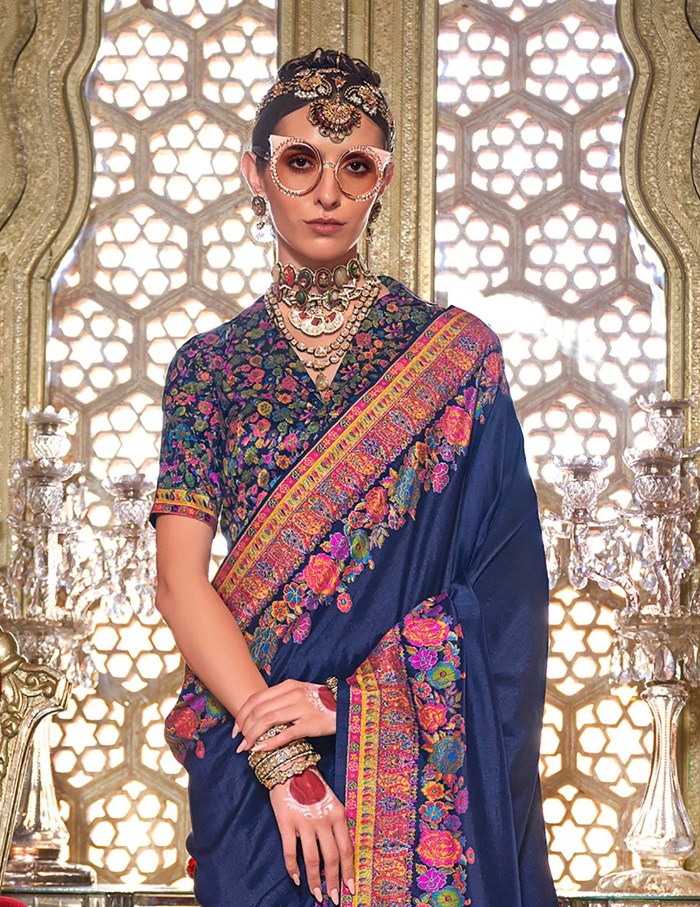 Drape elegance in this Navy Blue Floral Printed Saree made from Poly Viscose Silk with soft pashmina feel for cold-season festivities.
