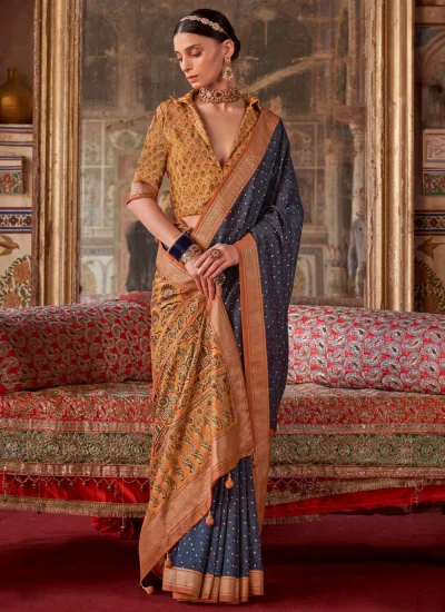 A timeless Navy Blue Silk Saree with printed motifs, perfect for festive evenings and cultural gatherings.