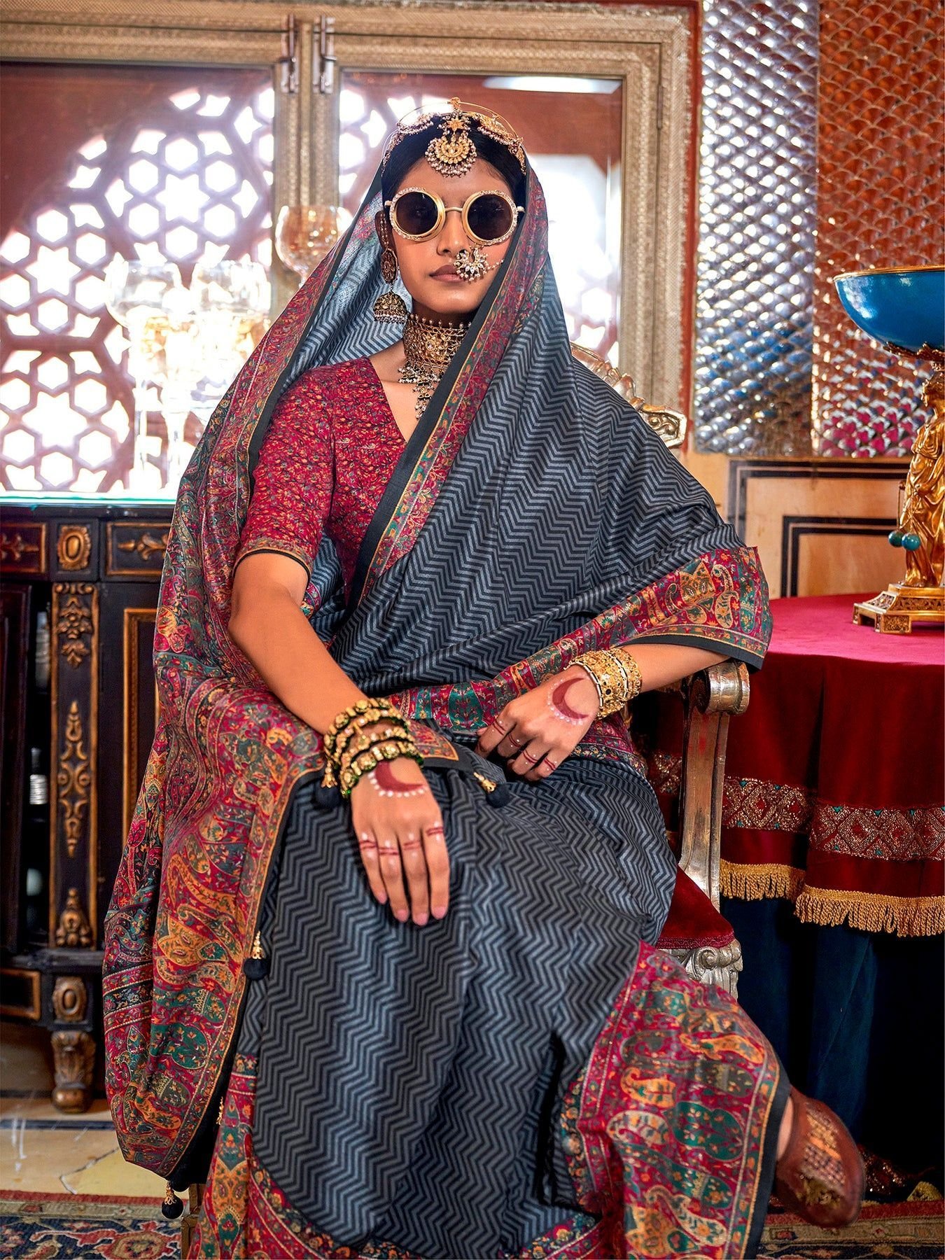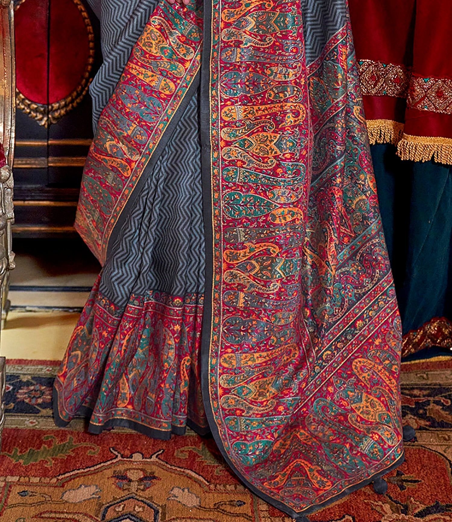 Navy Blue Soft Silk Saree with Stripes & Pashmina Print