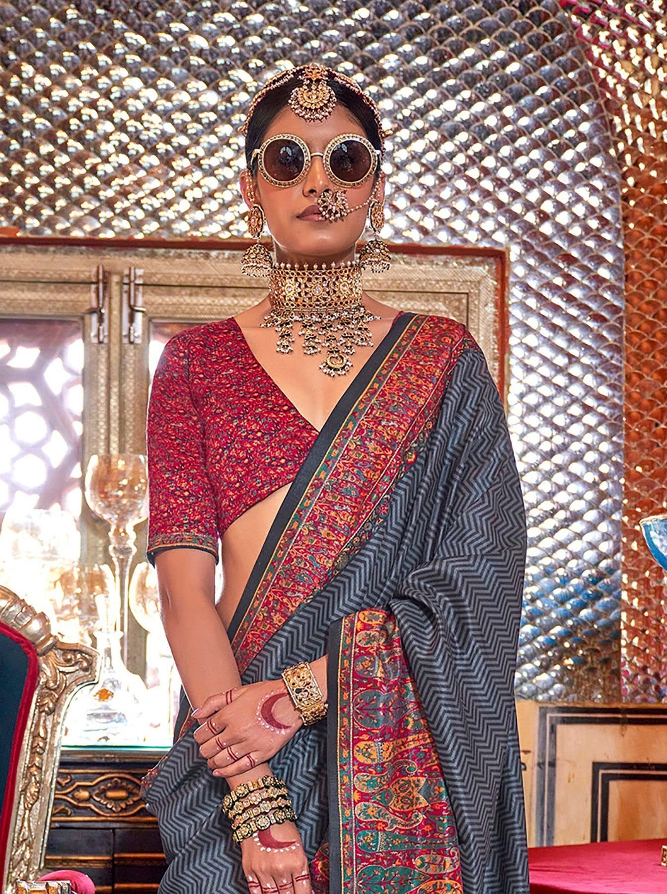 Graceful and versatile, this Navy Blue Soft Silk Saree with striped pattern and pashmina print is your go-to for office events and traditional outings.
