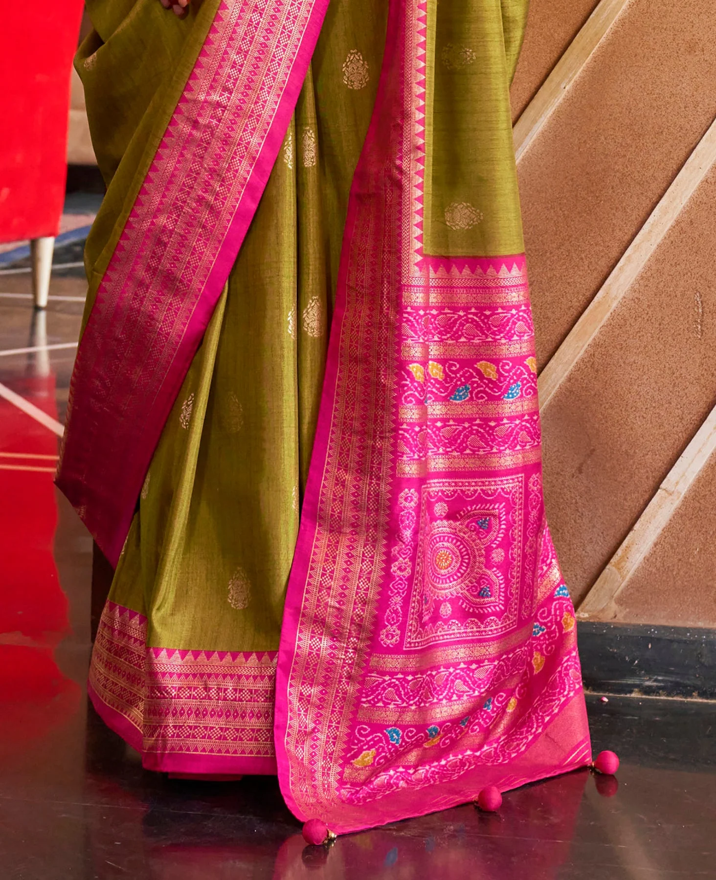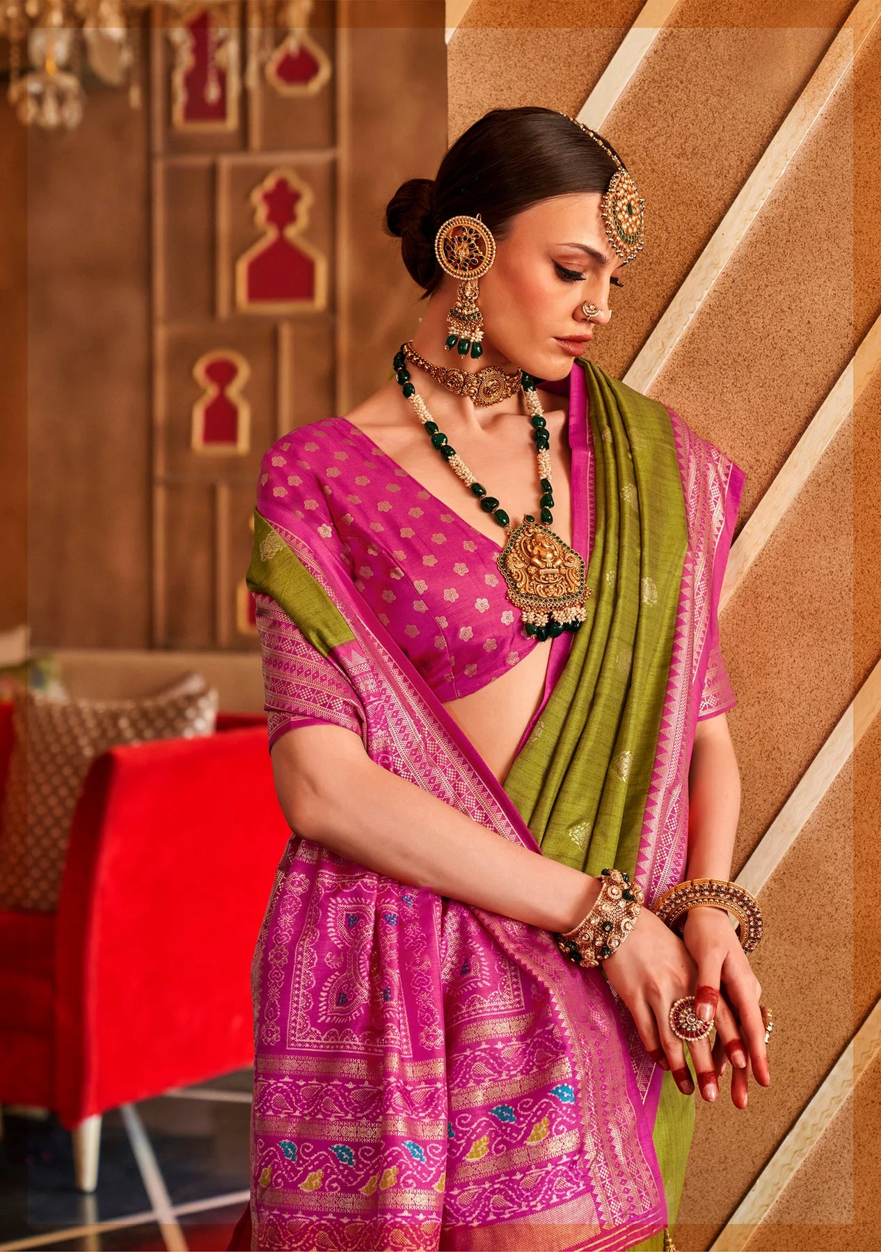 Crafted in luxurious Patola Silk, this Magenta Woven Designer Saree features intricate woven motifs and a soft, premium drape—perfect for weddings, festive and ethnic occasions.