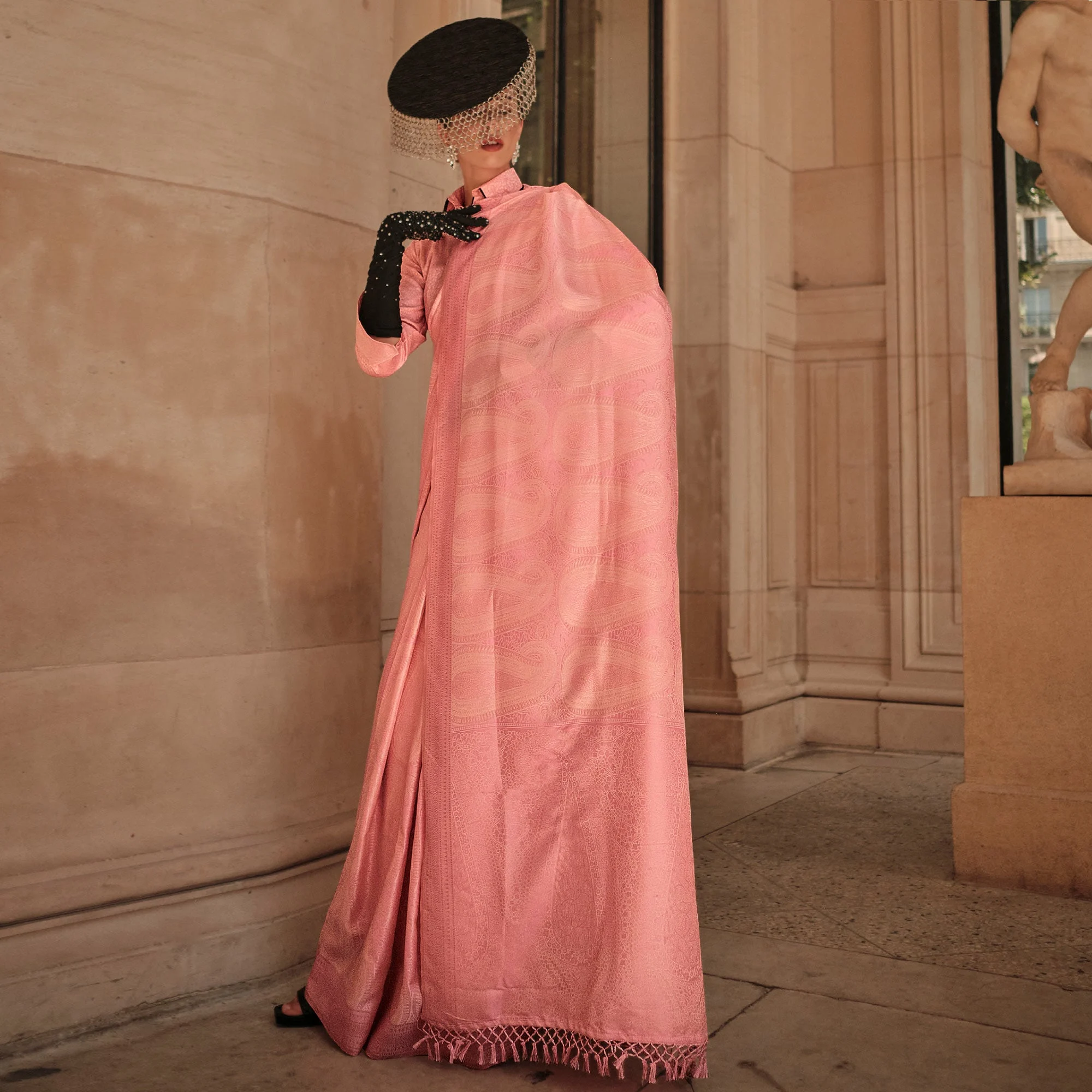 Elegant Peach Woven Satin Saree highlighted with tassel detailing, crafted for wedding and festive gatherings.