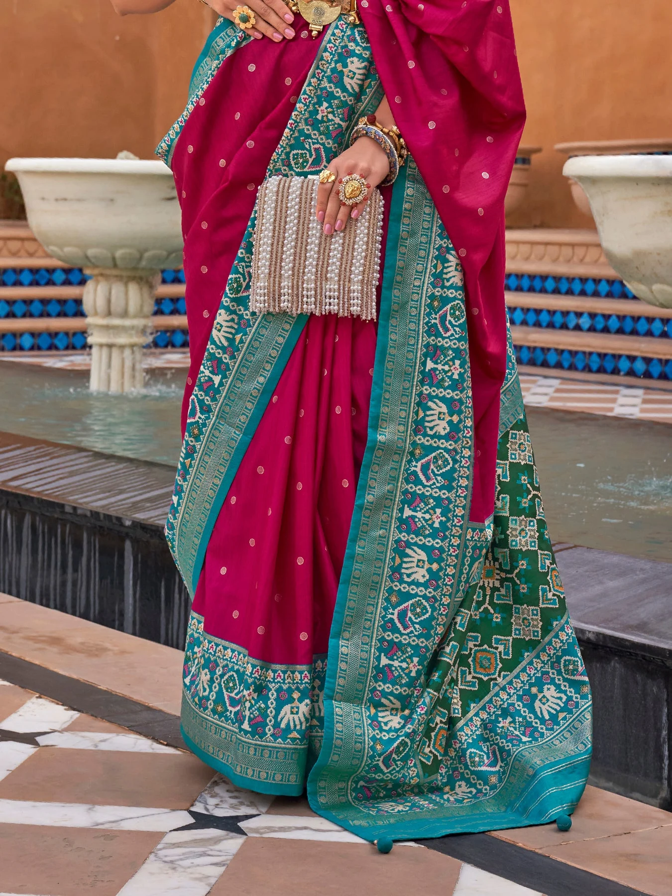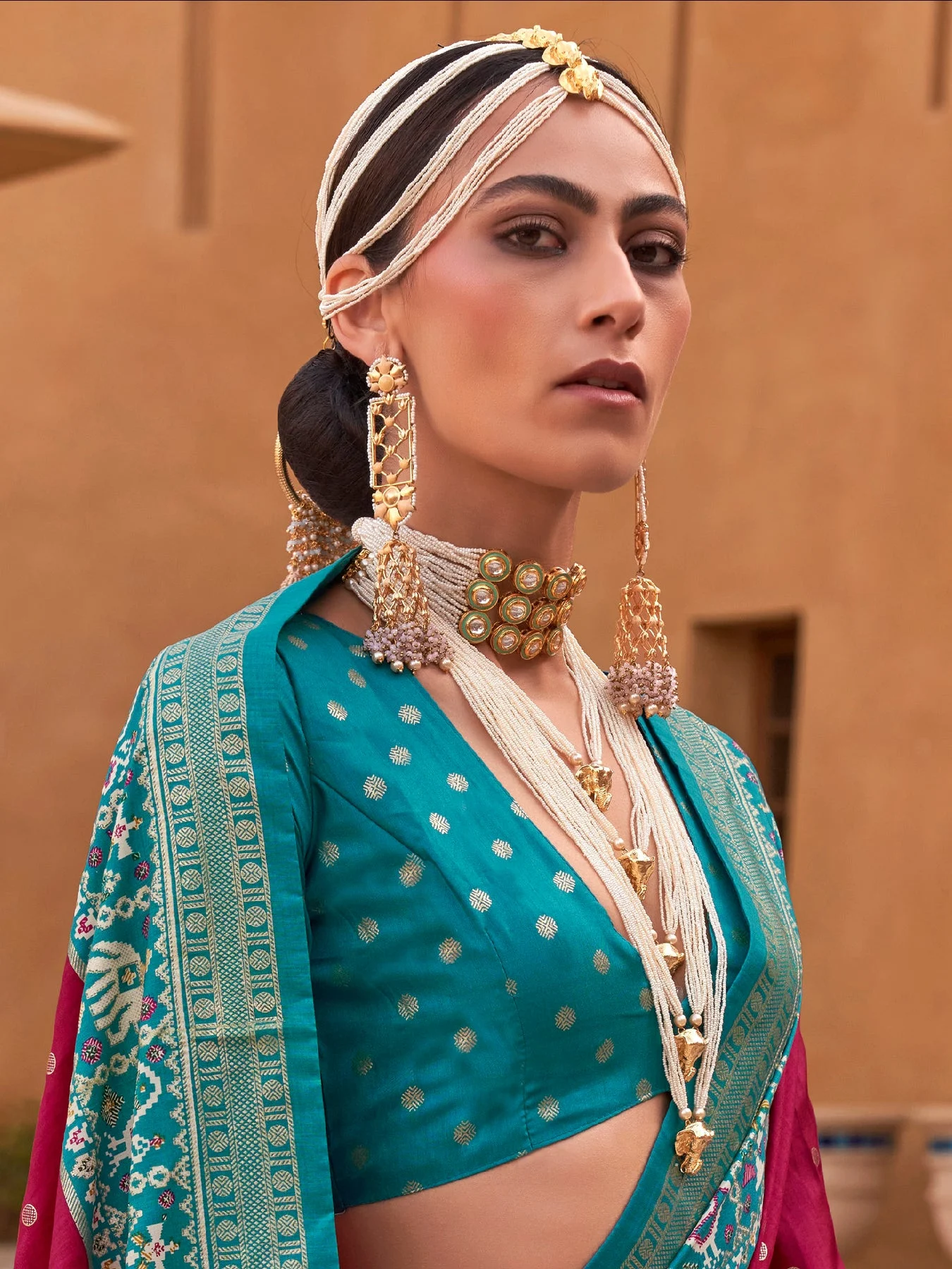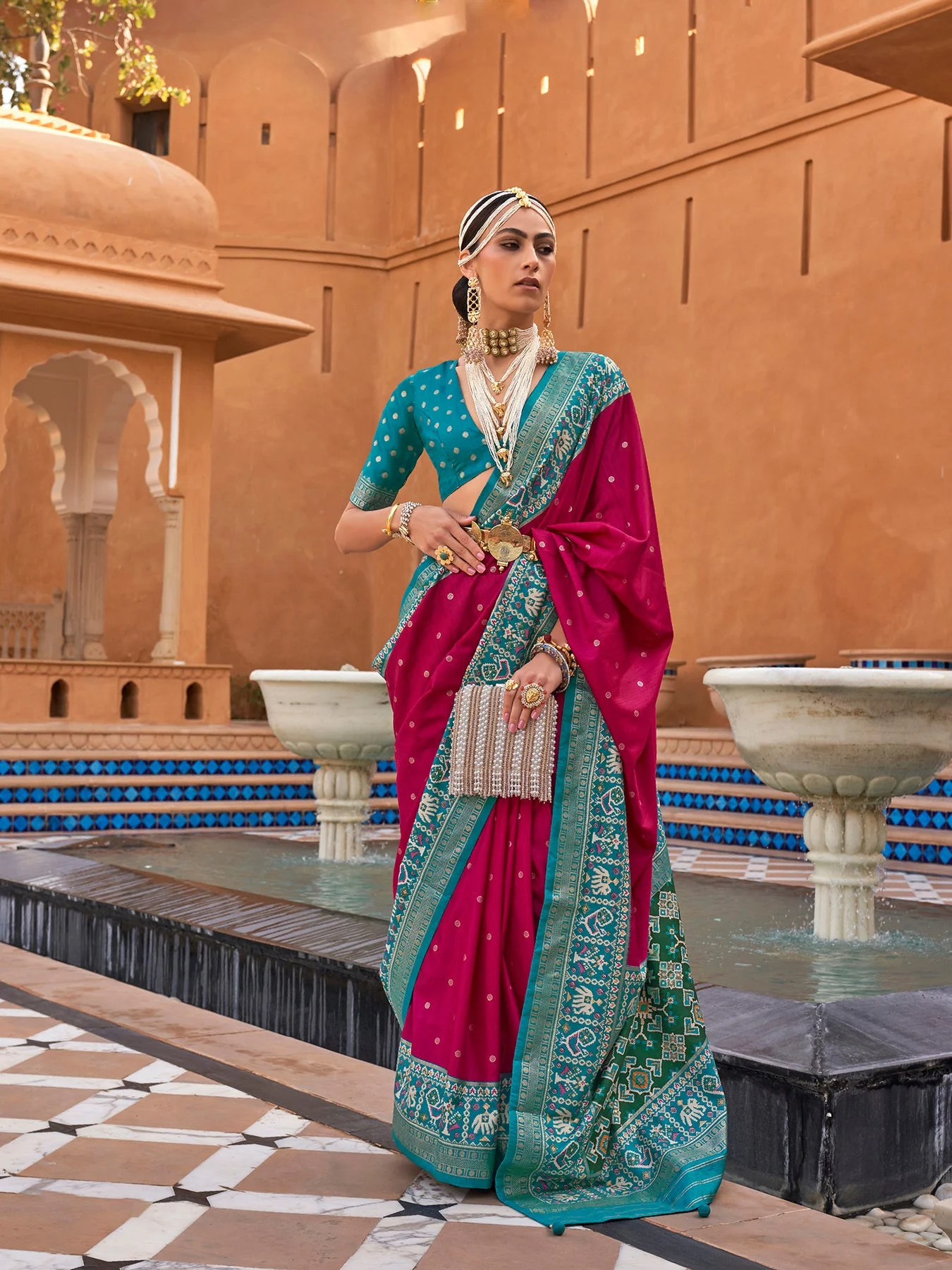 Crafted in Luxury Patola Silk, this woven saree features a rich designer pattern with traditional weaving, ideal for festive & wedding occasions.