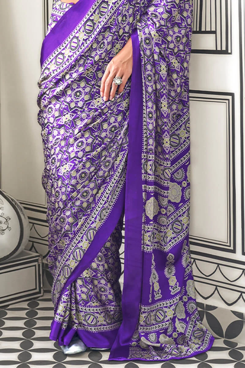 Purple Printed Ajrakh Satin Silk Saree