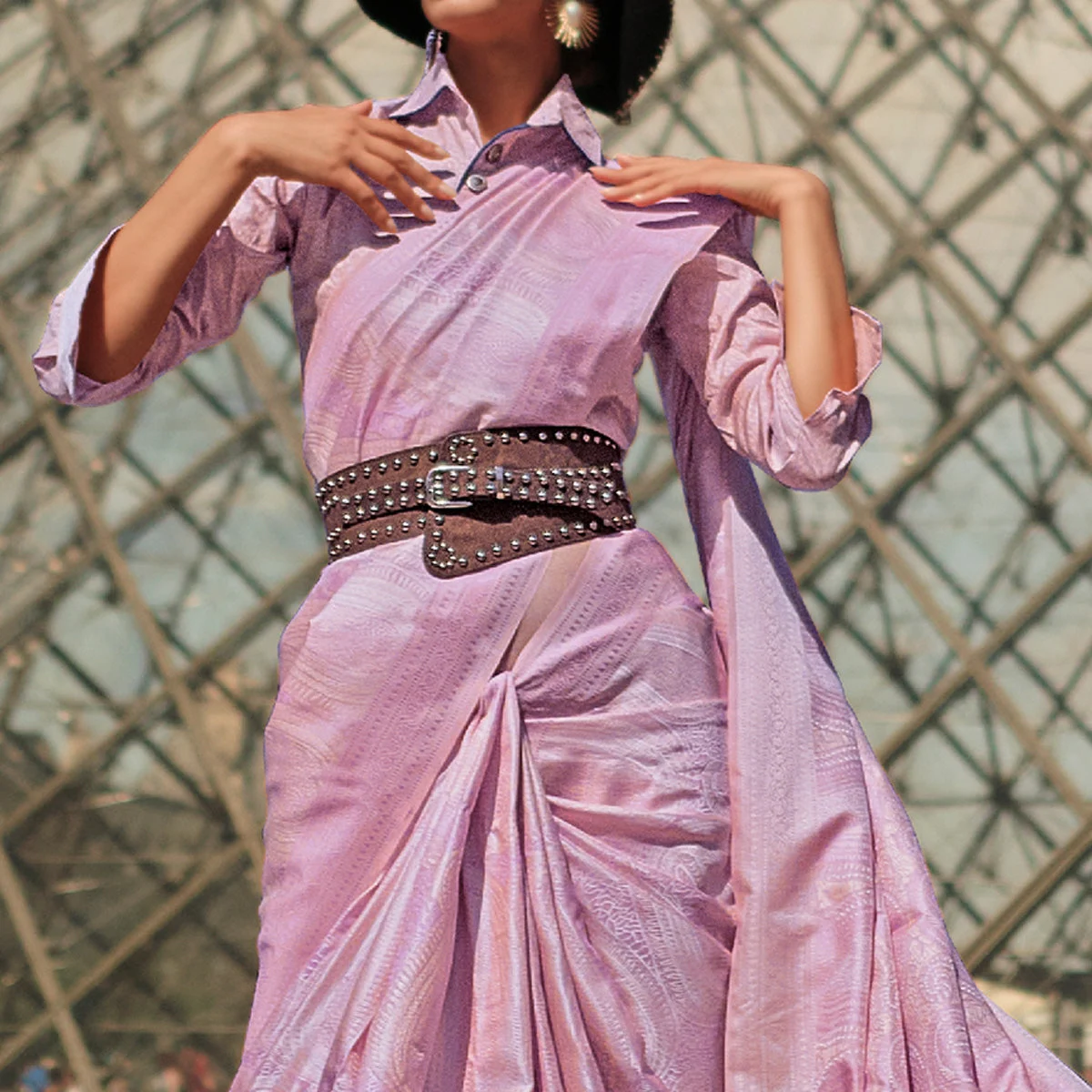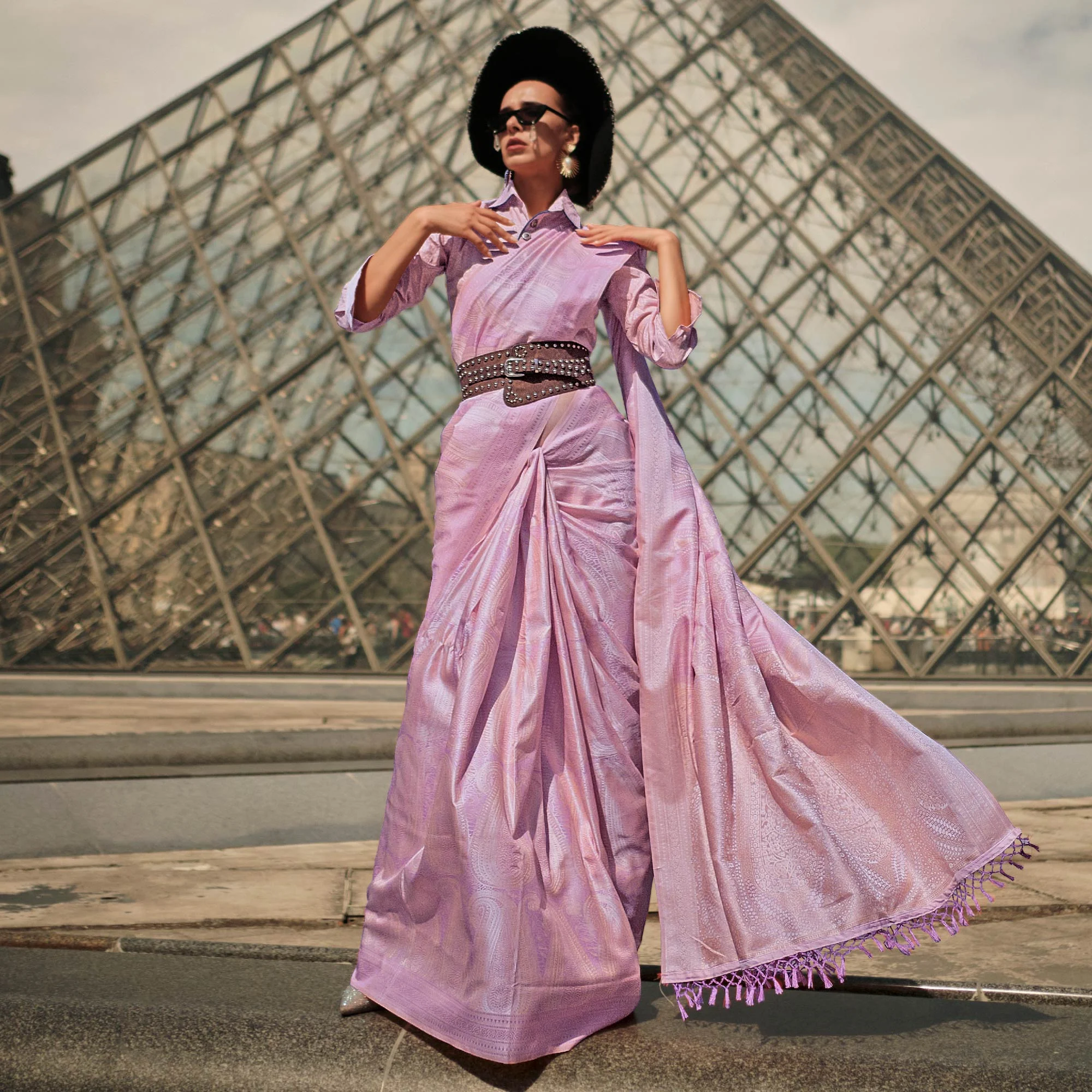 Stunning Purple Woven Satin Saree with tassel finish, making it perfect for cultural celebrations and party occasions.