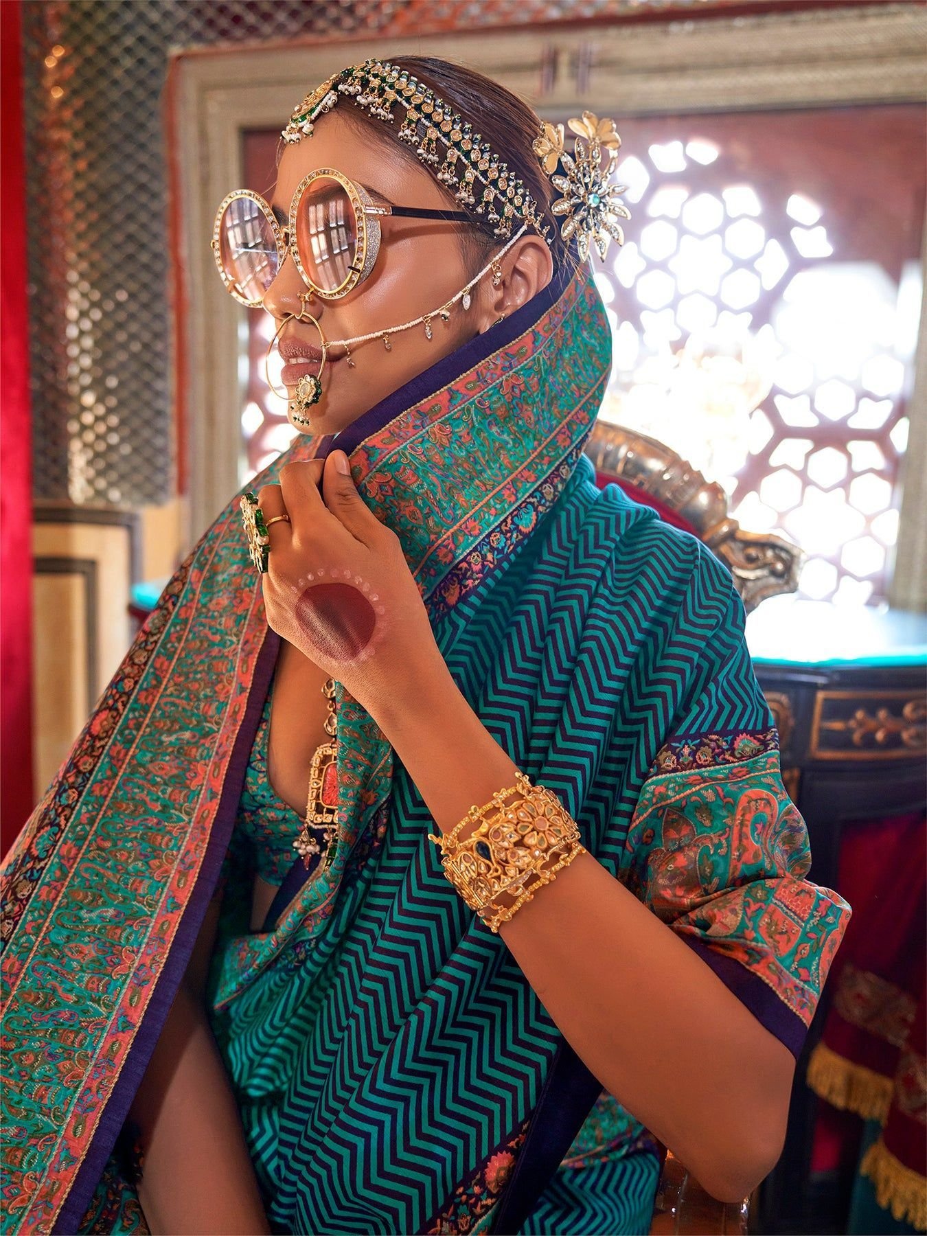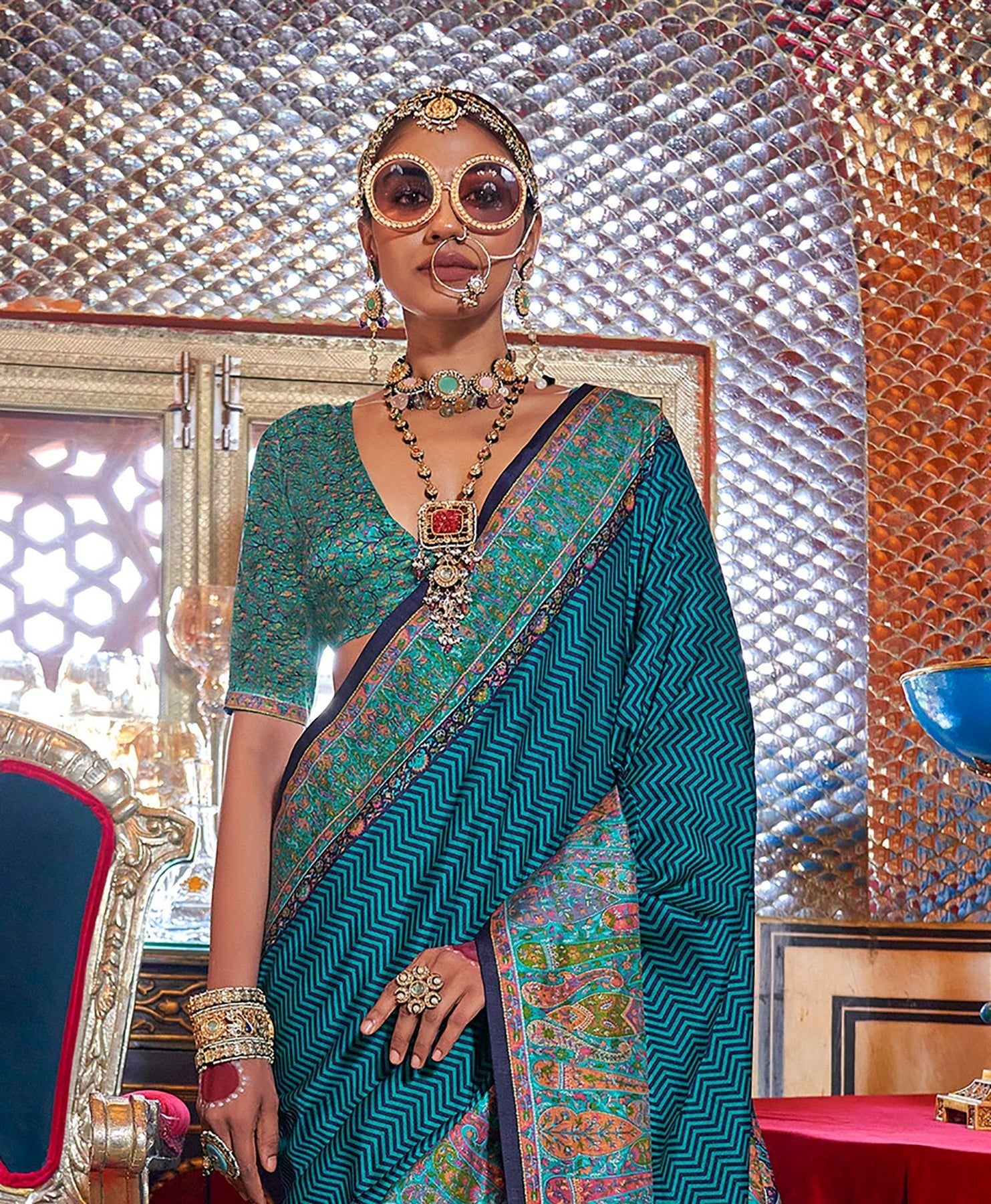 Embrace regal charm in this Rama Green Soft Silk Saree. With elegant striped patterns and pashmina-style motifs, it’s ideal for graceful traditional occasions.