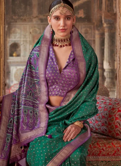 A traditional green silk saree with timeless printed designs—perfect for rituals, weddings, and cultural occasions.