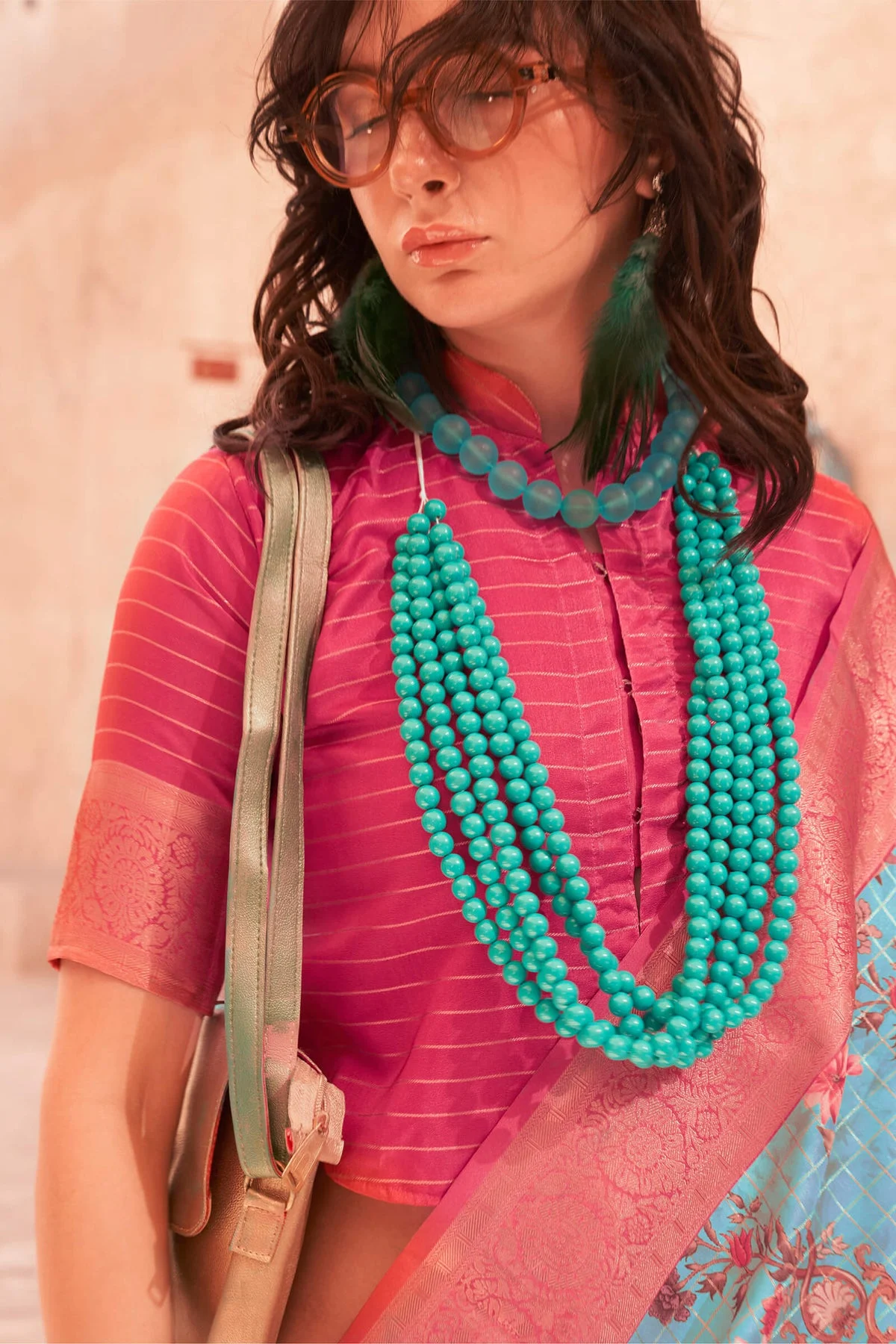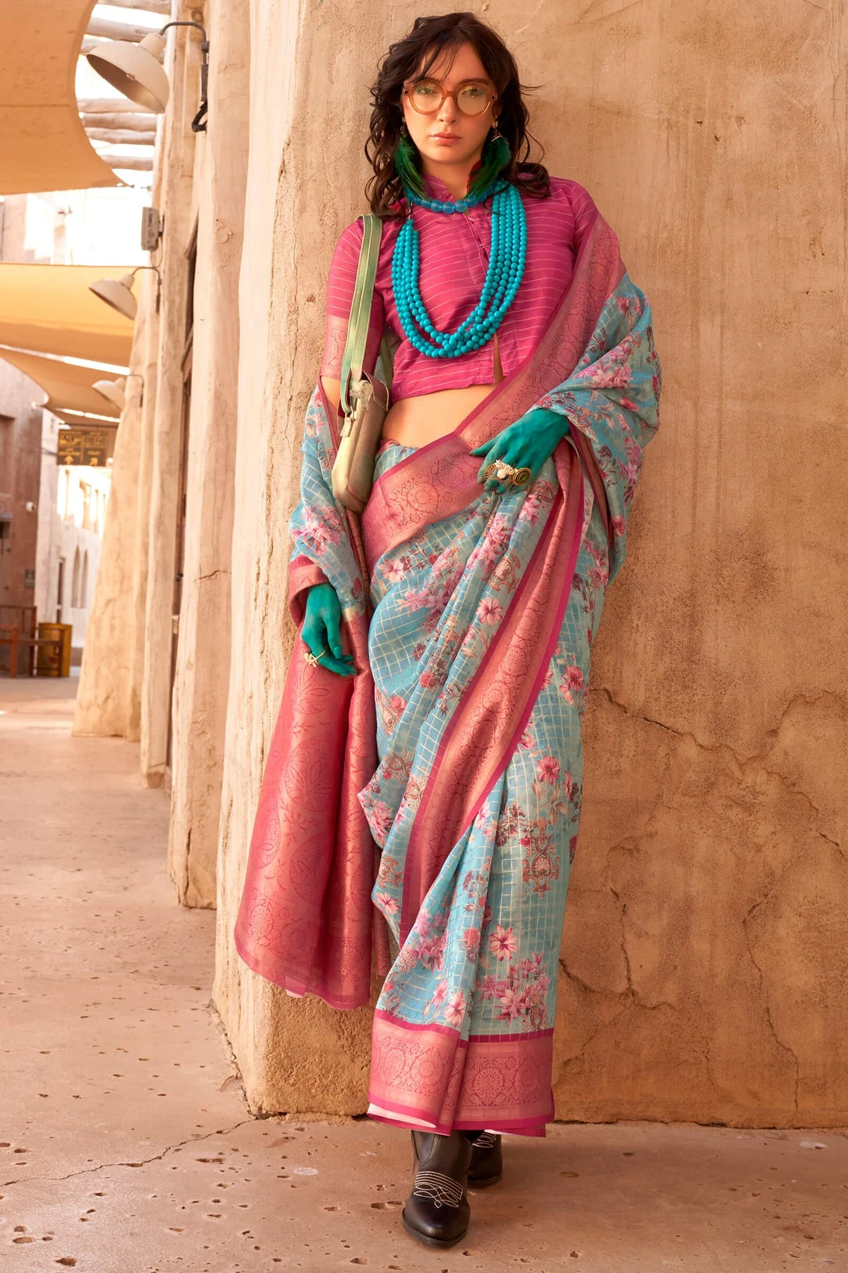 Crafted in premium Georgette, this Sky and Pink Saree features Zari woven detailing with intricate prints, perfect for festive and wedding occasions.
