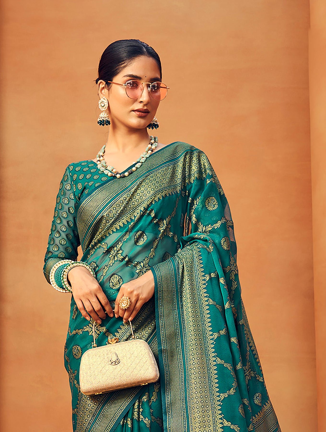 Teal Poly Viscose Georgette Woven Banarasi Designer Saree