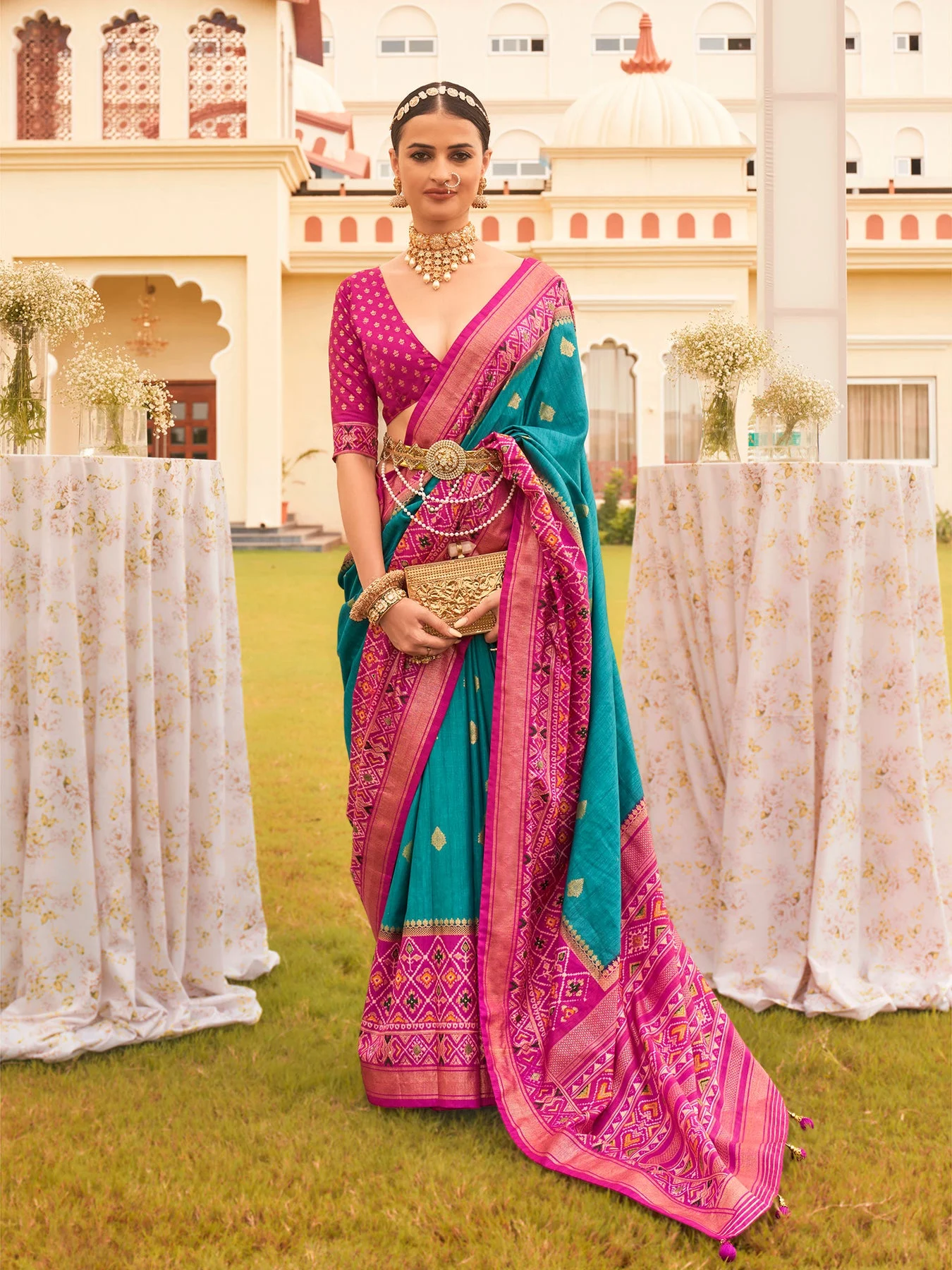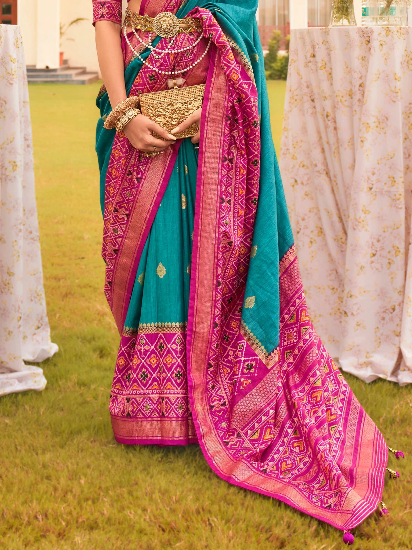 This Turquoise Patola Silk Saree showcases intricate printed patterns with a traditional touch—ideal for ethnic wear lovers.